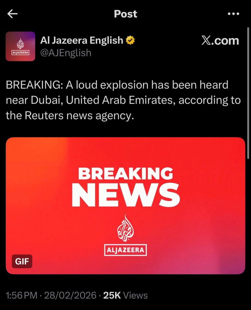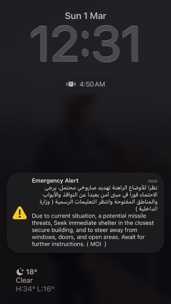 At 2:38PM, I went to my local Carrefour and bought half a dozen 1.5L of bottled water because, one, we ran out, and two, just in case. Plus a few groceries for the night. We were planning to have Iftar outside at an Indonesian restaurant in JLT, but then a post on Threads said missiles were spotted (and intercepted) in Marina, which was across the area we wanted to go to.